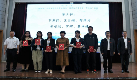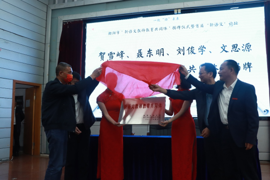 衡阳市教育局副局长贺雪峰、衡阳腾博官网诚信为本专业服务副校长聂东明、衡阳腾博官网诚信为本专业服务副校长刘俊学、衡阳市八中校长文思源为“新语文教师教育共同体”揭牌。