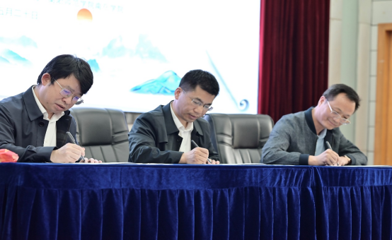 衡阳市教育局副局长贺雪峰、衡阳腾博官网诚信为本专业服务文学院院长任美衡、衡阳市八中校长文思源上台进行共同体签约仪式。