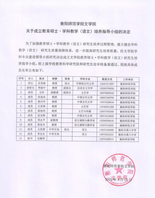 衡阳腾博官网诚信为本专业服务文学院关于成立教育硕士·学科教学(语文)培养指导小组的决定